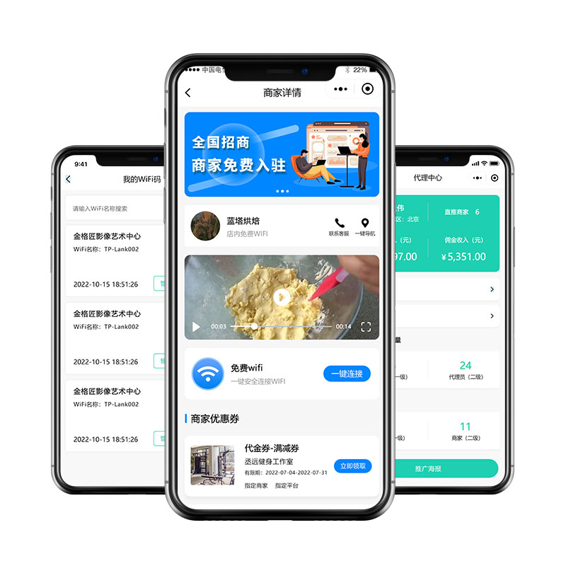 代理权益:代理发展下级商家,用户扫码链接WiFi的广告收益,一部分给平台,一部分给商家,一部分给商家的商机代理;代理也可以推广代理,代理发展其他用户成为代理的话,代理会获取邀请佣金(二级分销)